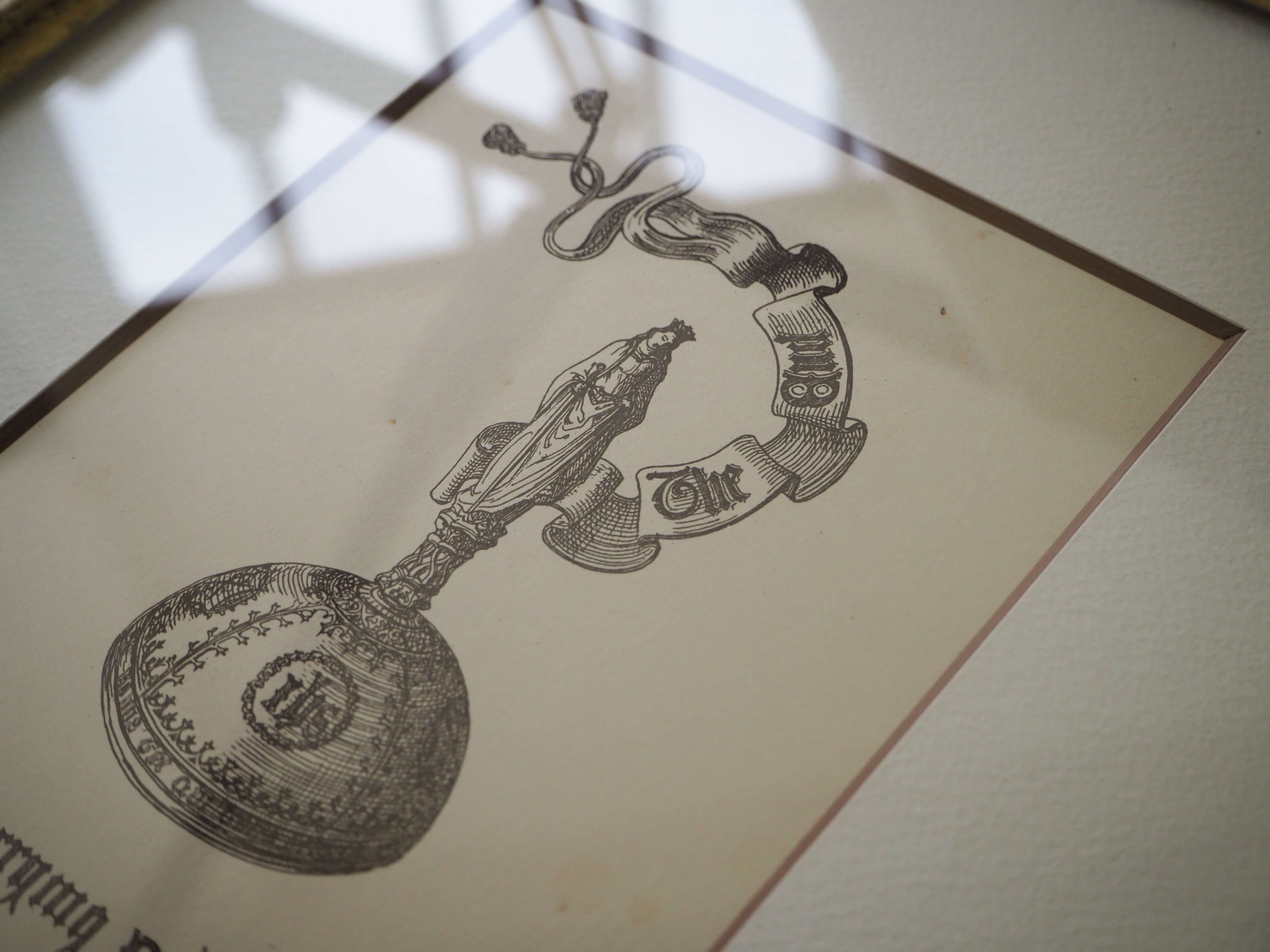 また、鐘の上には聖母マリアと思われる像が立っており、そのポーズや、祈りを表したリボンの装飾もとても美しく描かれています。