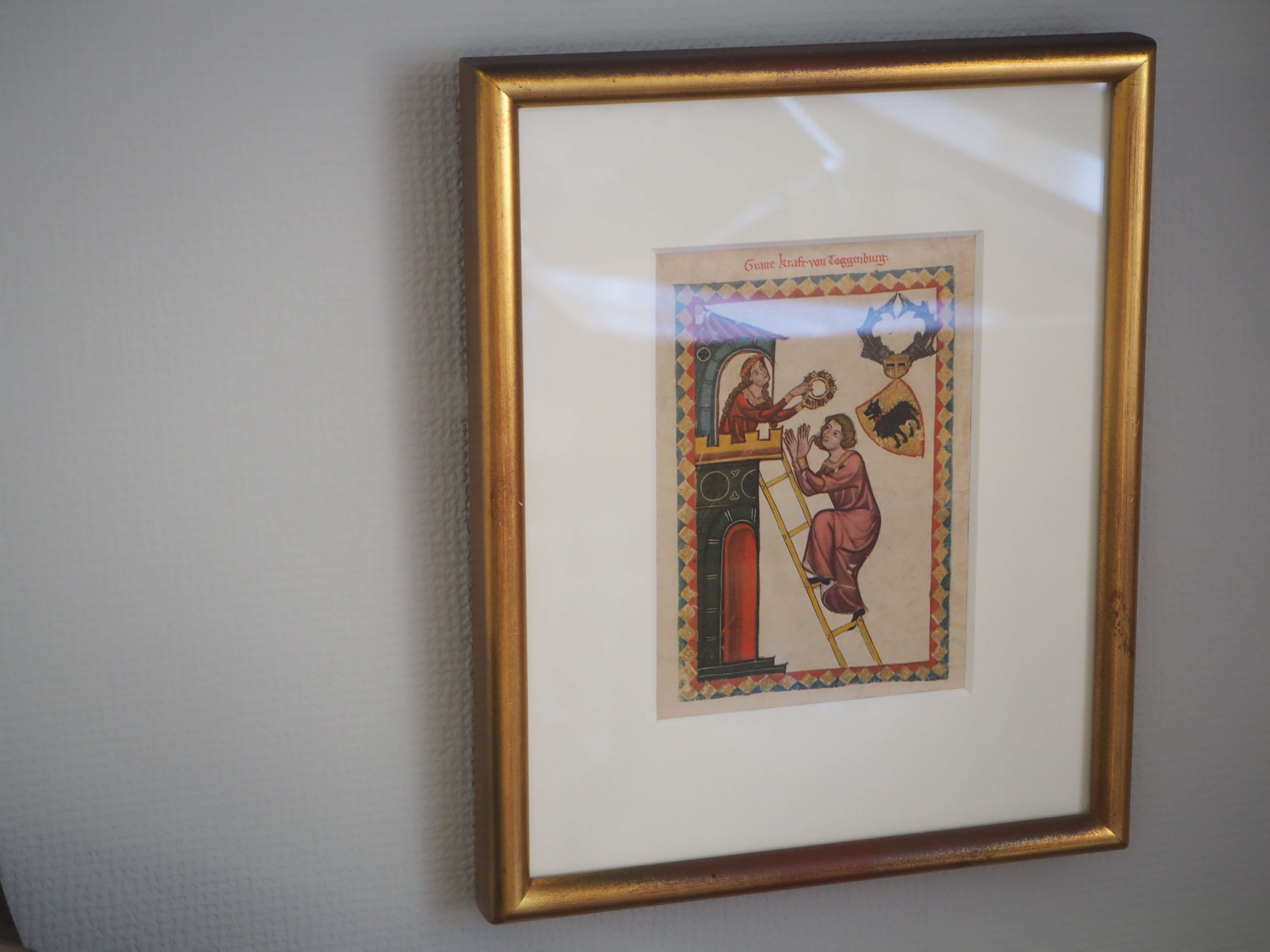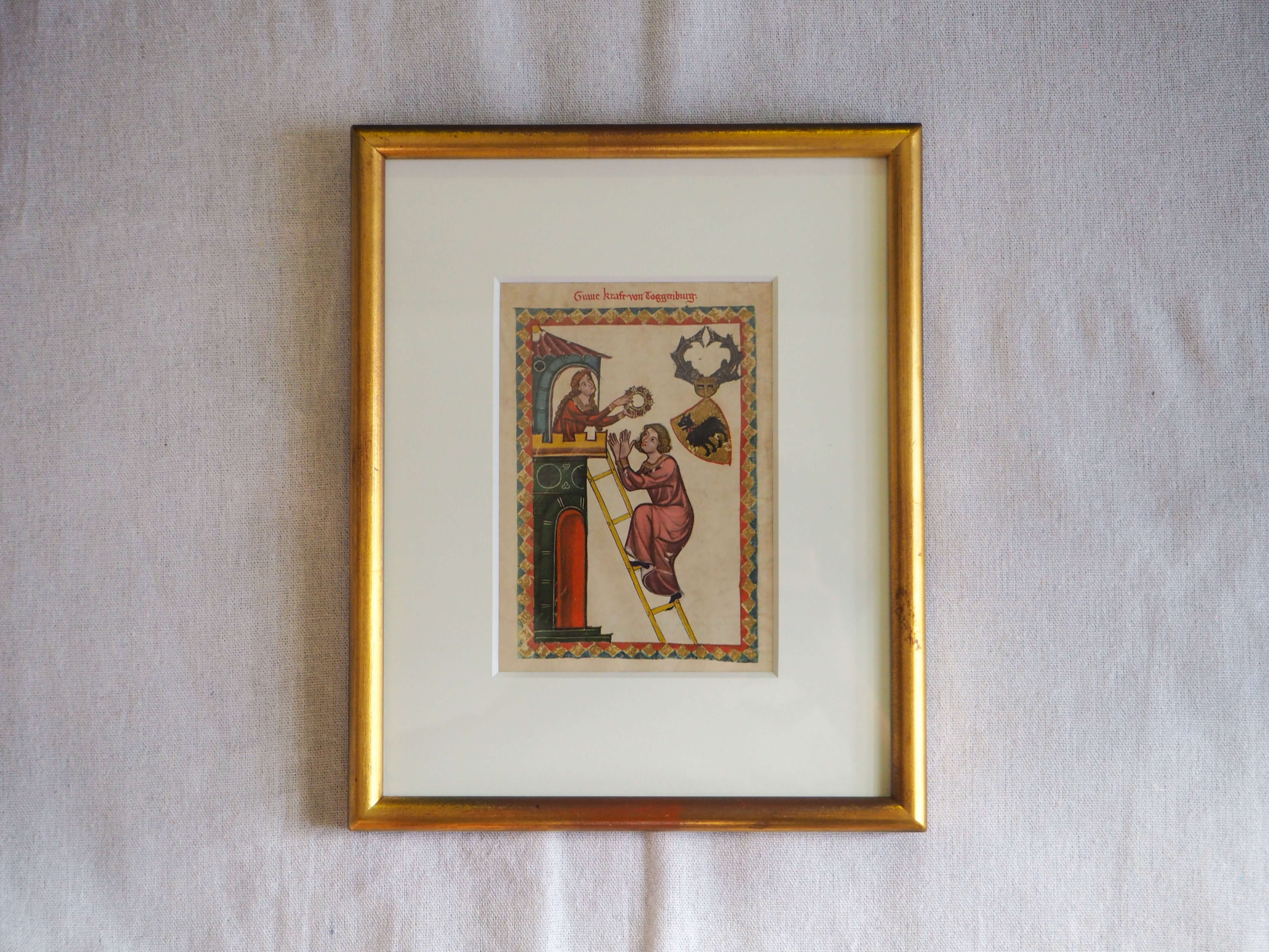 インゼル文庫第450番『マネッセ写本のミンネザンガーたち』より、美しい配色と象徴的なモチーフが印象的な図版を、古いフレームに額装しました。