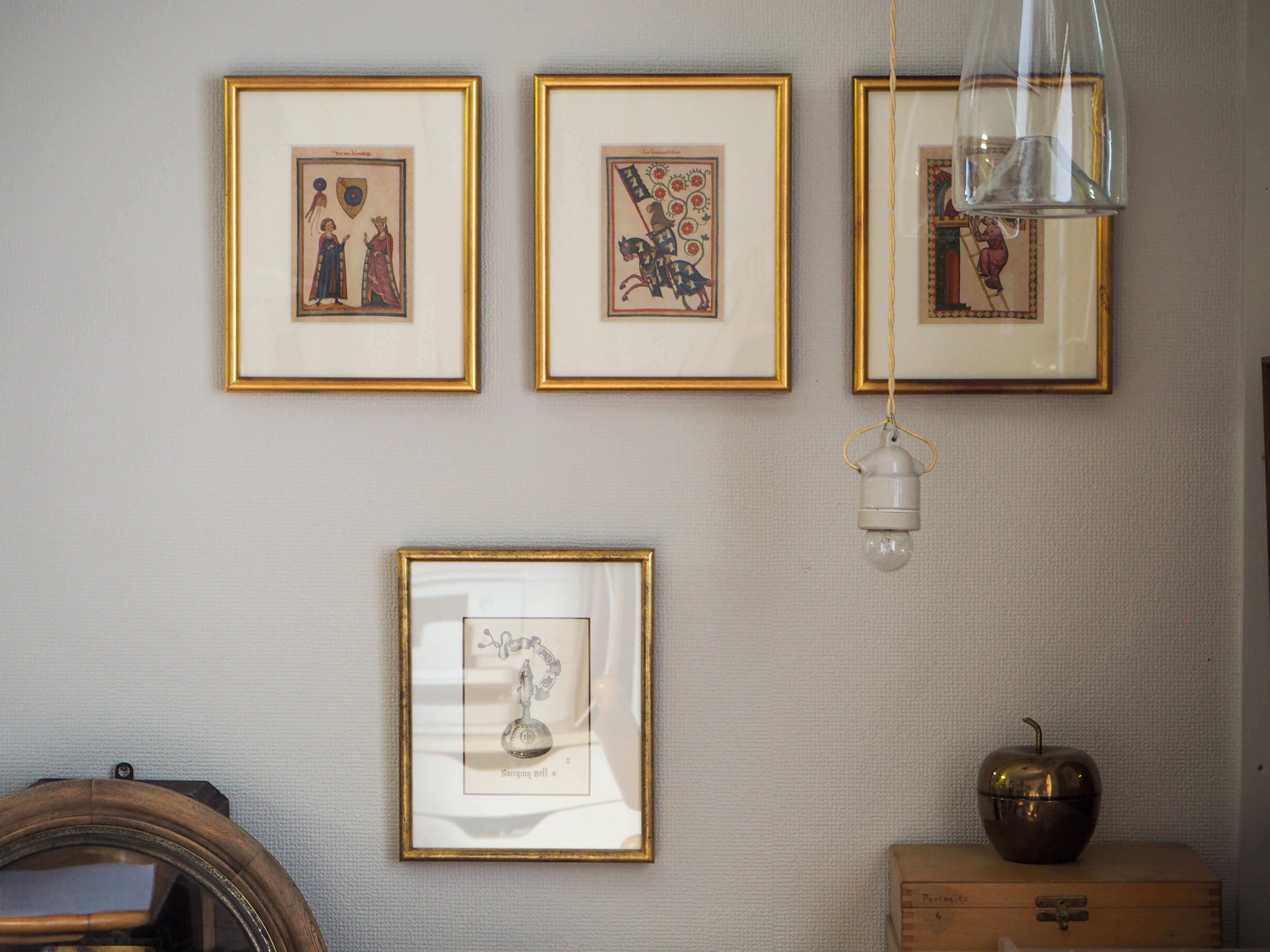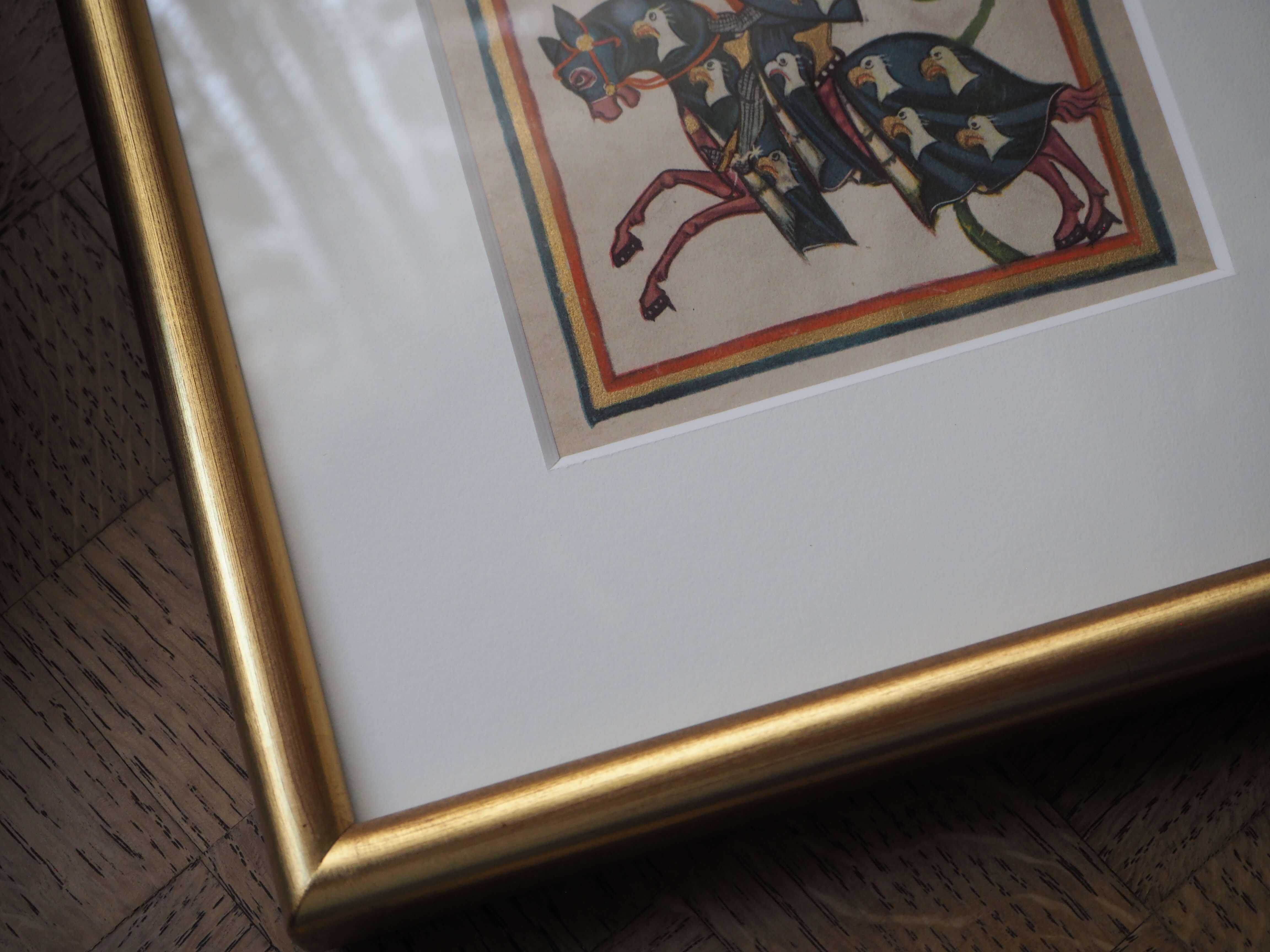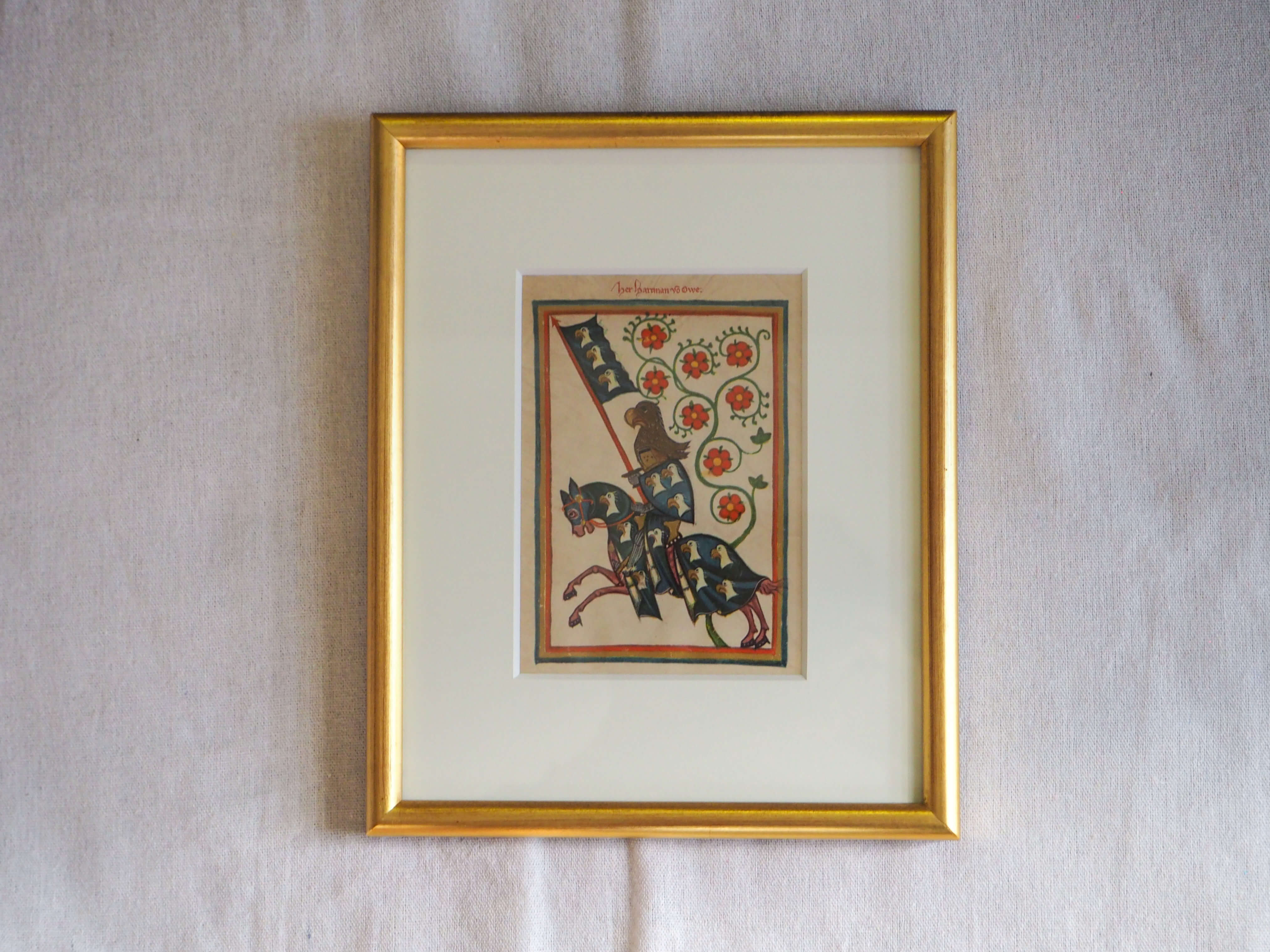 インゼル文庫第450番『マネッセ写本のミンネザンガーたちより』から、美しい配色と象徴的なモチーフが印象的な図版を、古いフレームに額装しました。