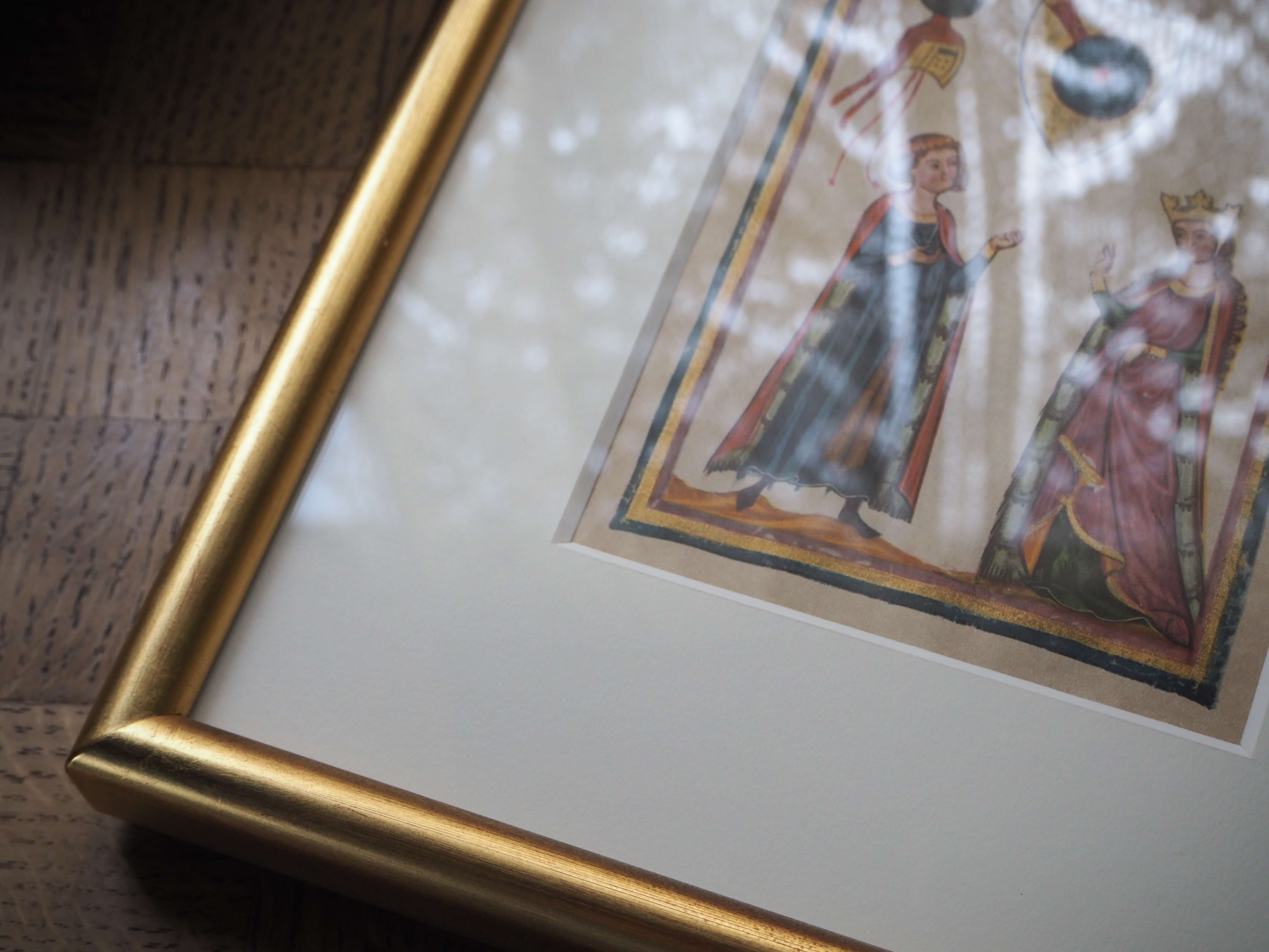 インゼル文庫第450番『マネッセ写本のミンネザンガーたちより』から、美しい配色と象徴的なモチーフが印象的な図版を、古い額に額装しました。