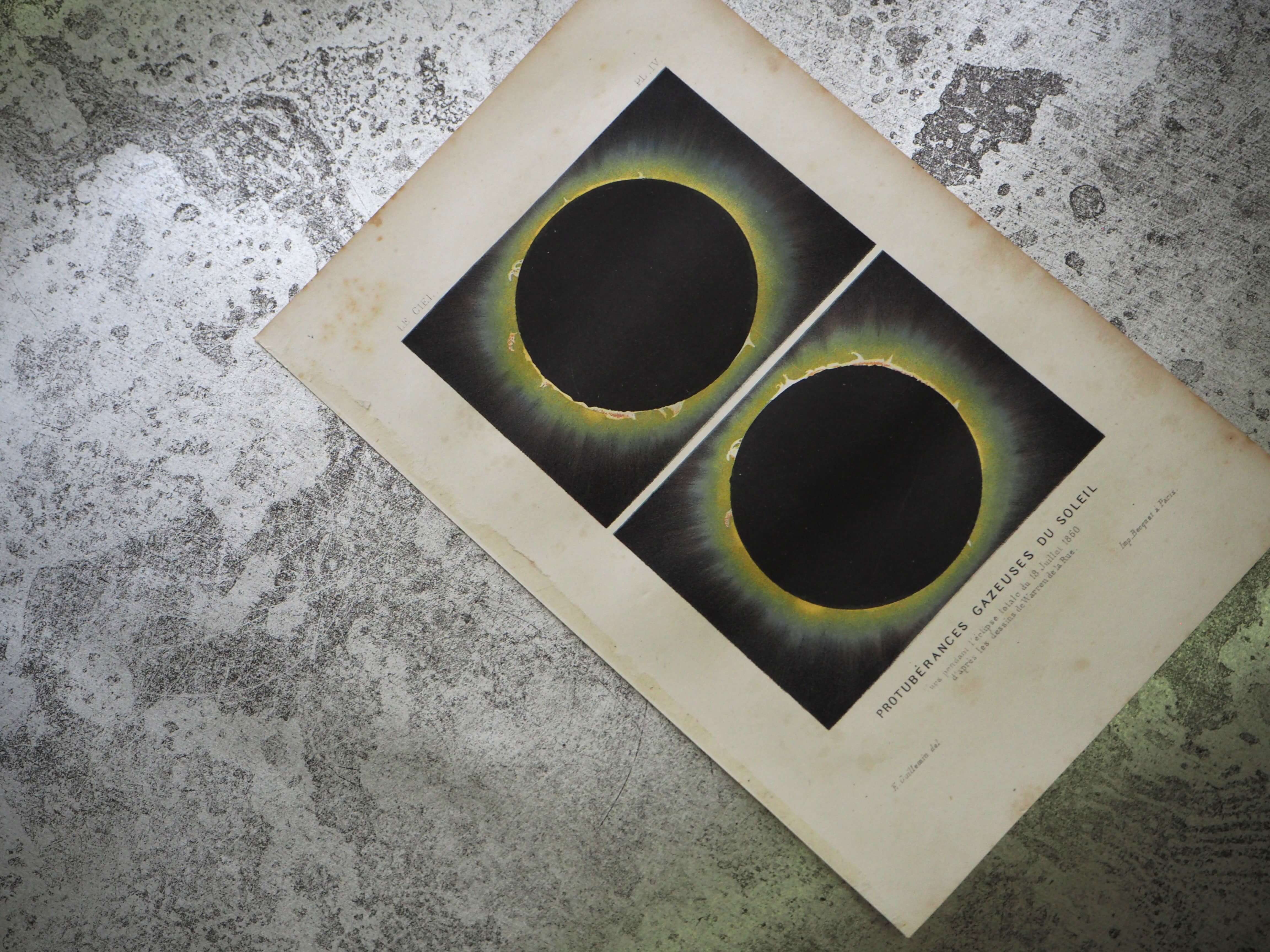 多彩な色が使われているわけではありませんが、月の影から太陽の光がこぼれだすの神秘的な様子が見事に表現されています。厚みのあるしっかりとした紙に刷られた図で、当時の雰囲気をそのまま感じていただけます。