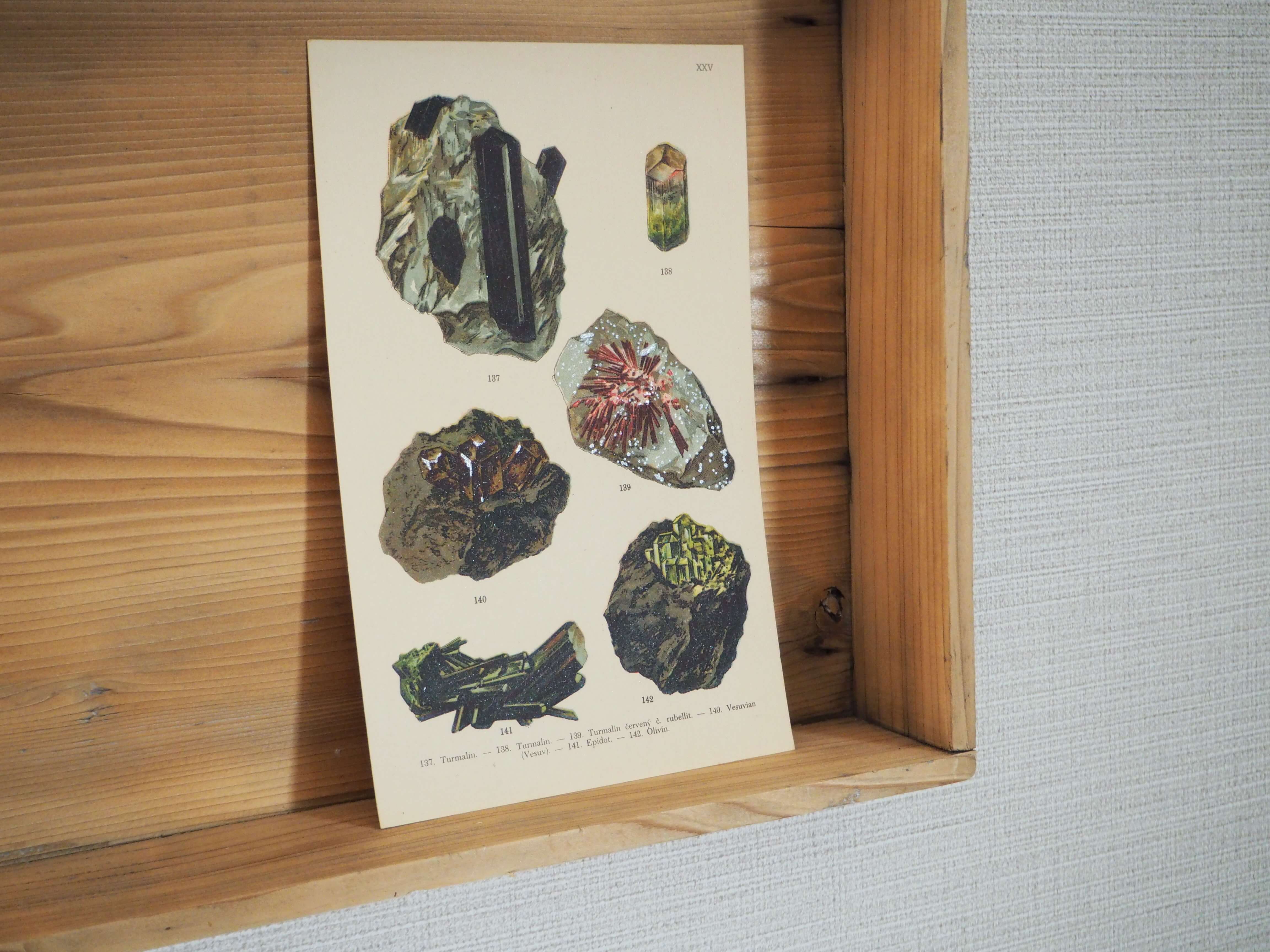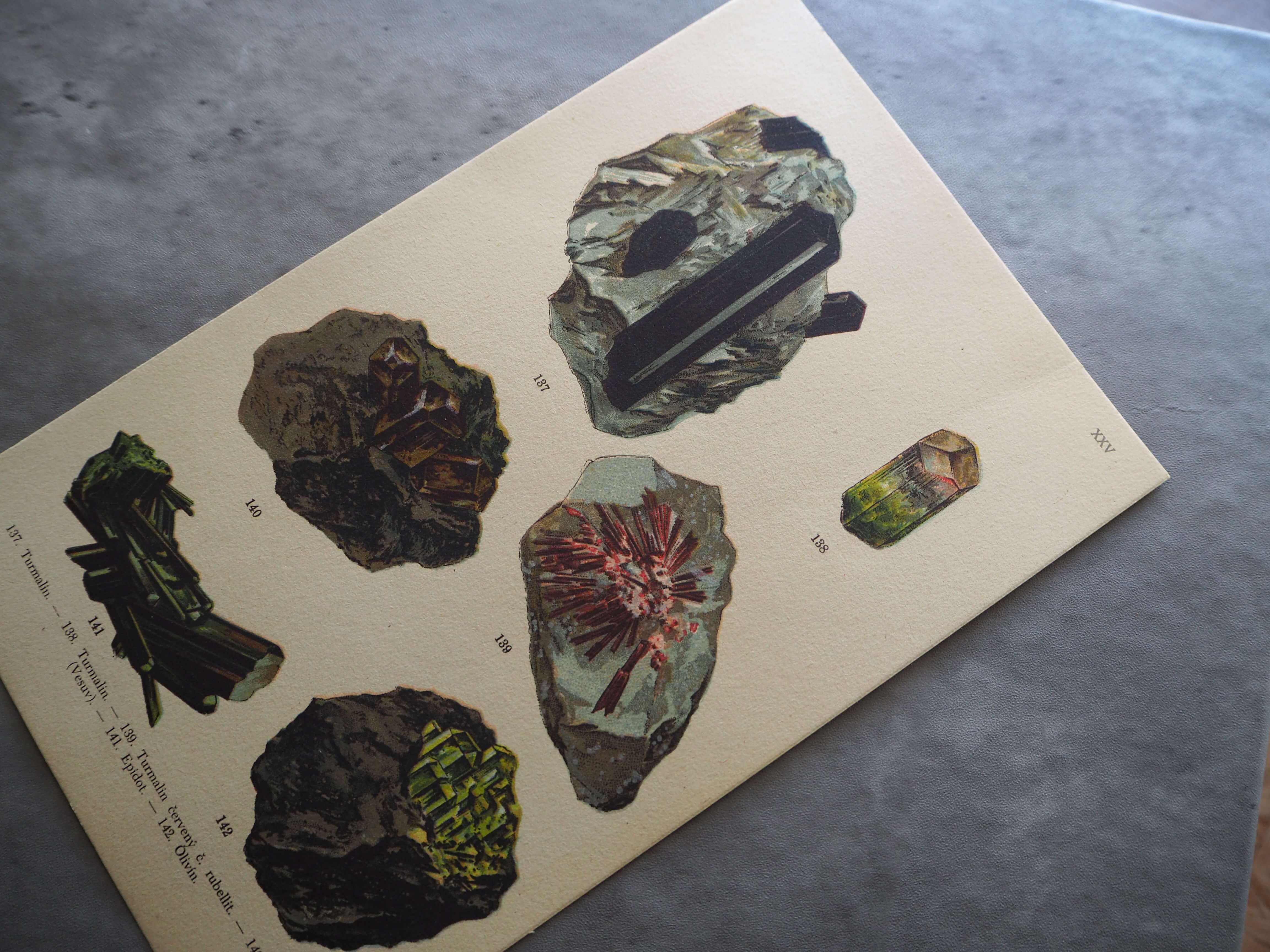 色彩が美しい鉱物の図版。1920年代頃にチェコで出版された古い図鑑からの1葉です。
