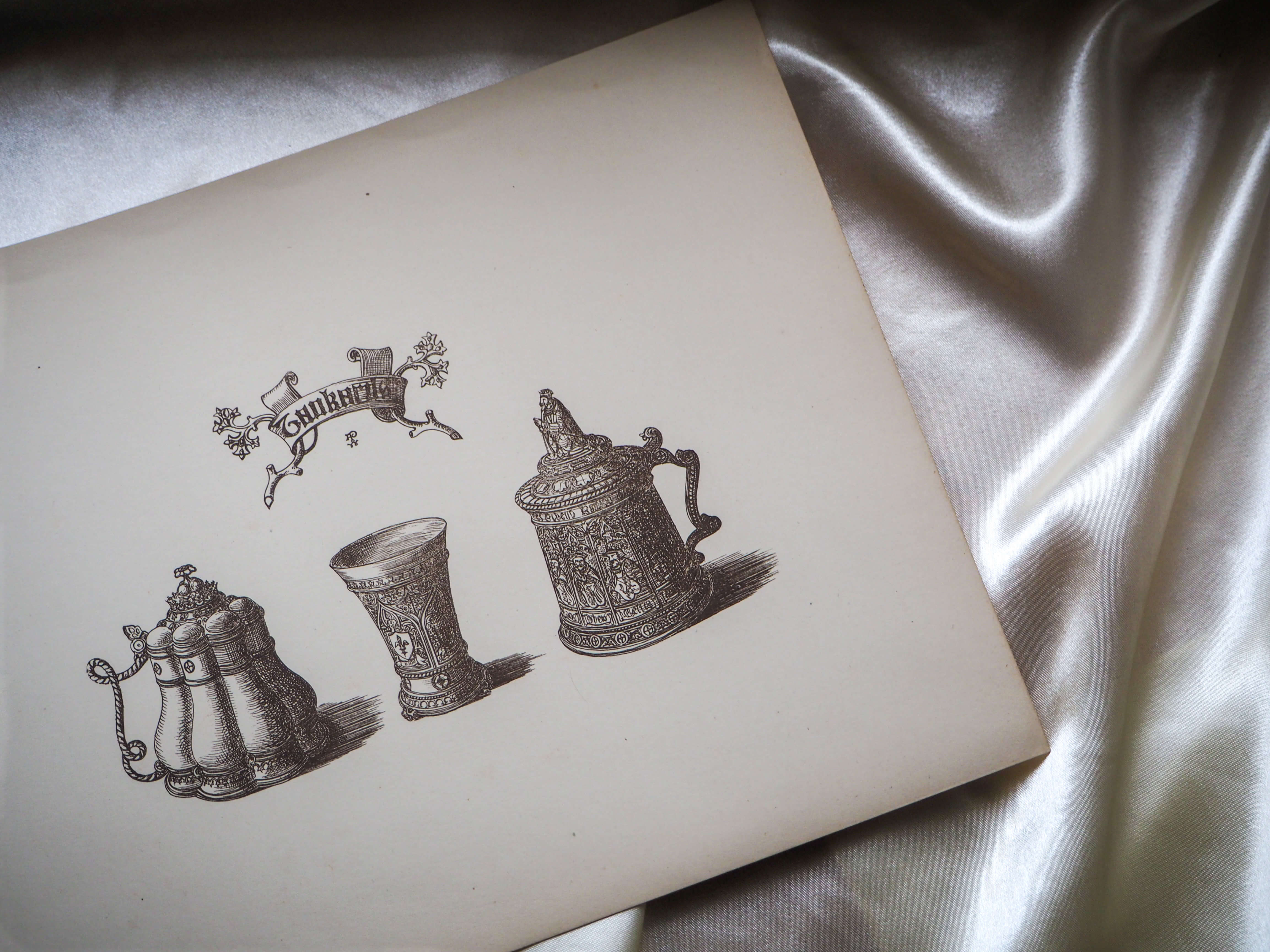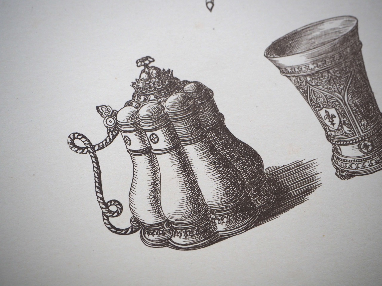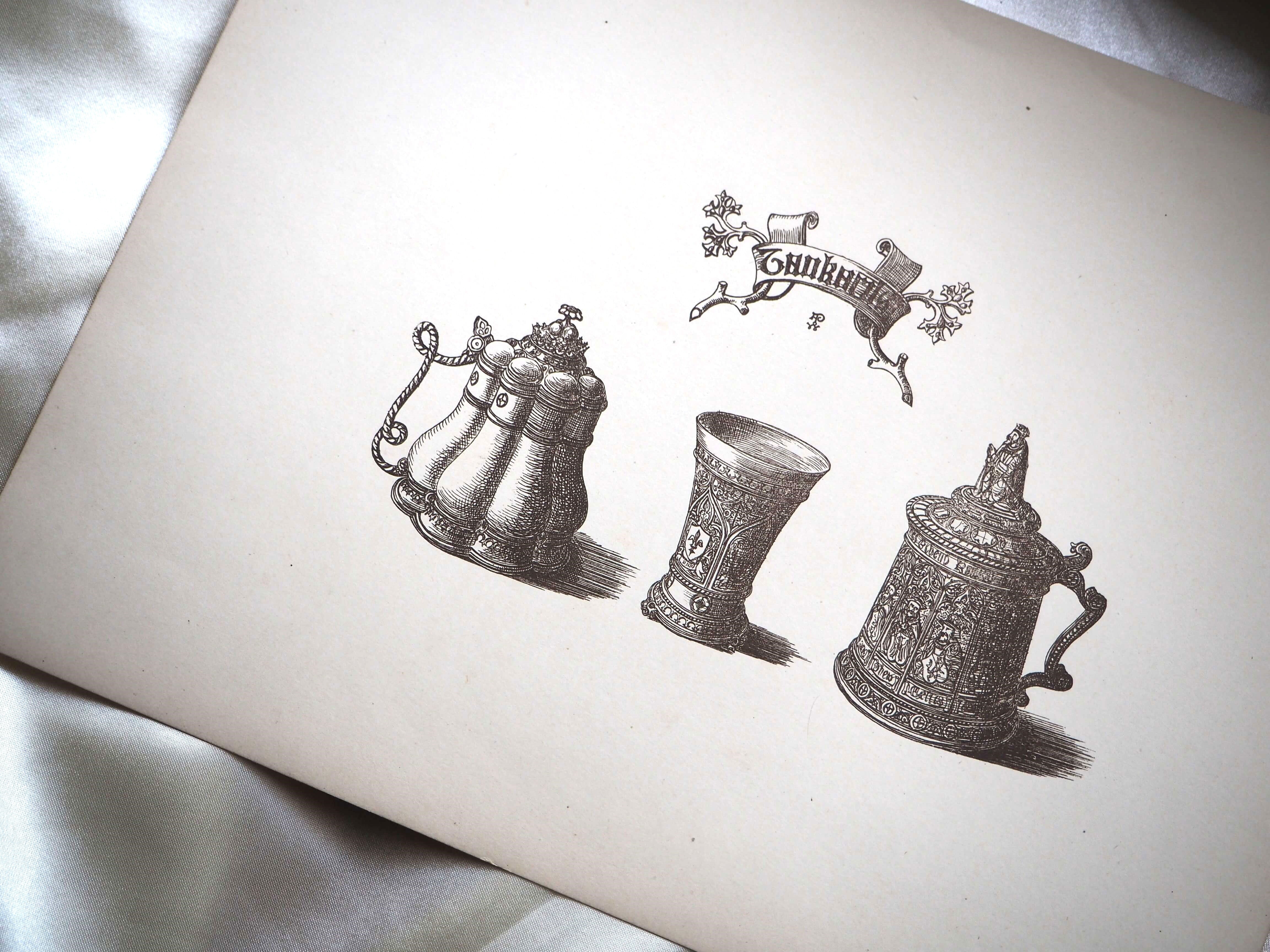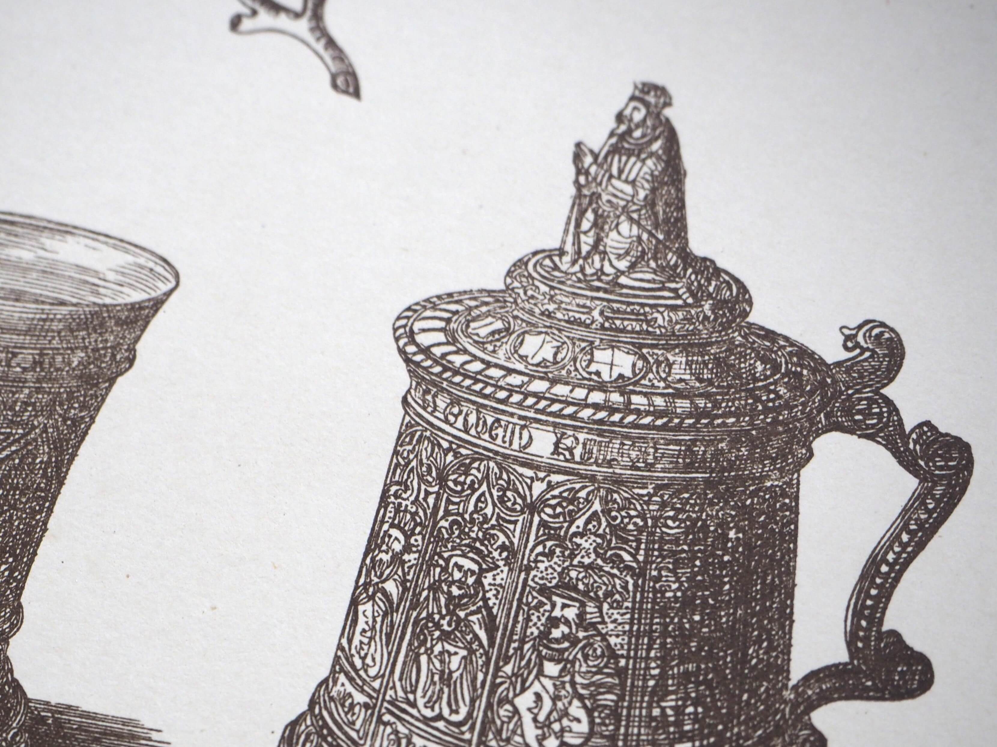 こちらには3つのタンカードが描かれています。右のタンカードの蓋には王様のようなモチーフが付いており、現代の感覚で見ると、なんだか可愛らしい印象もありますね。
