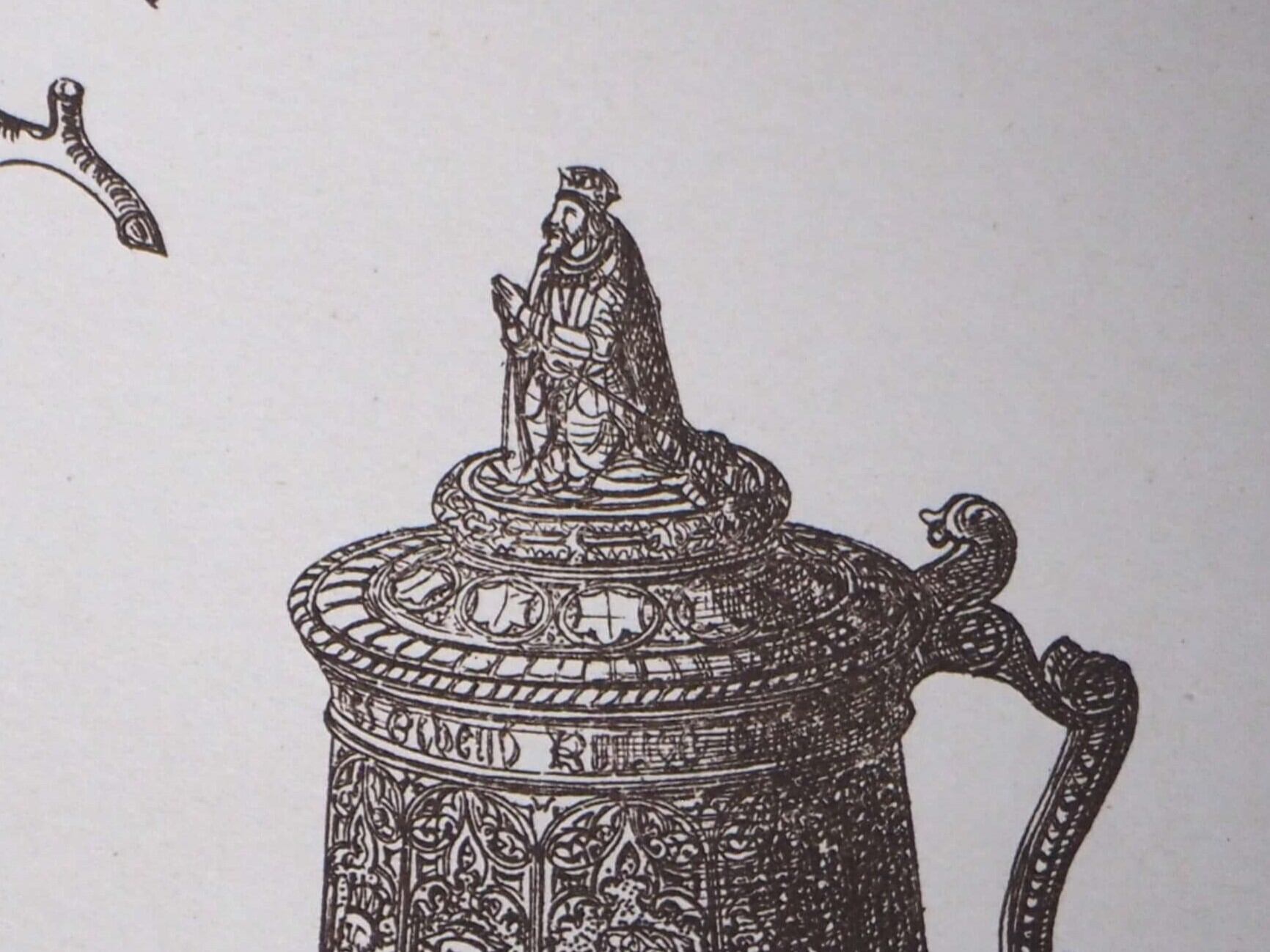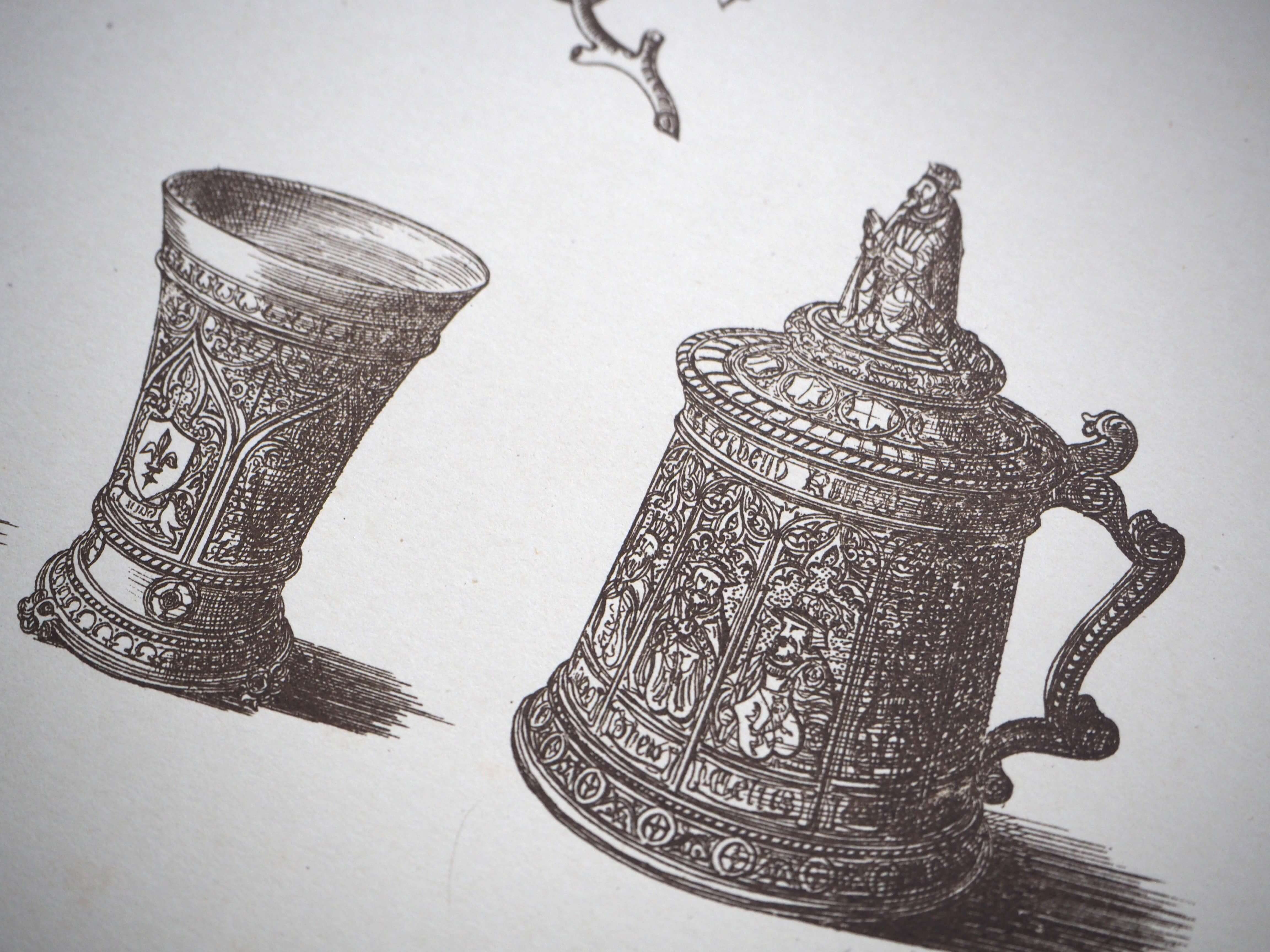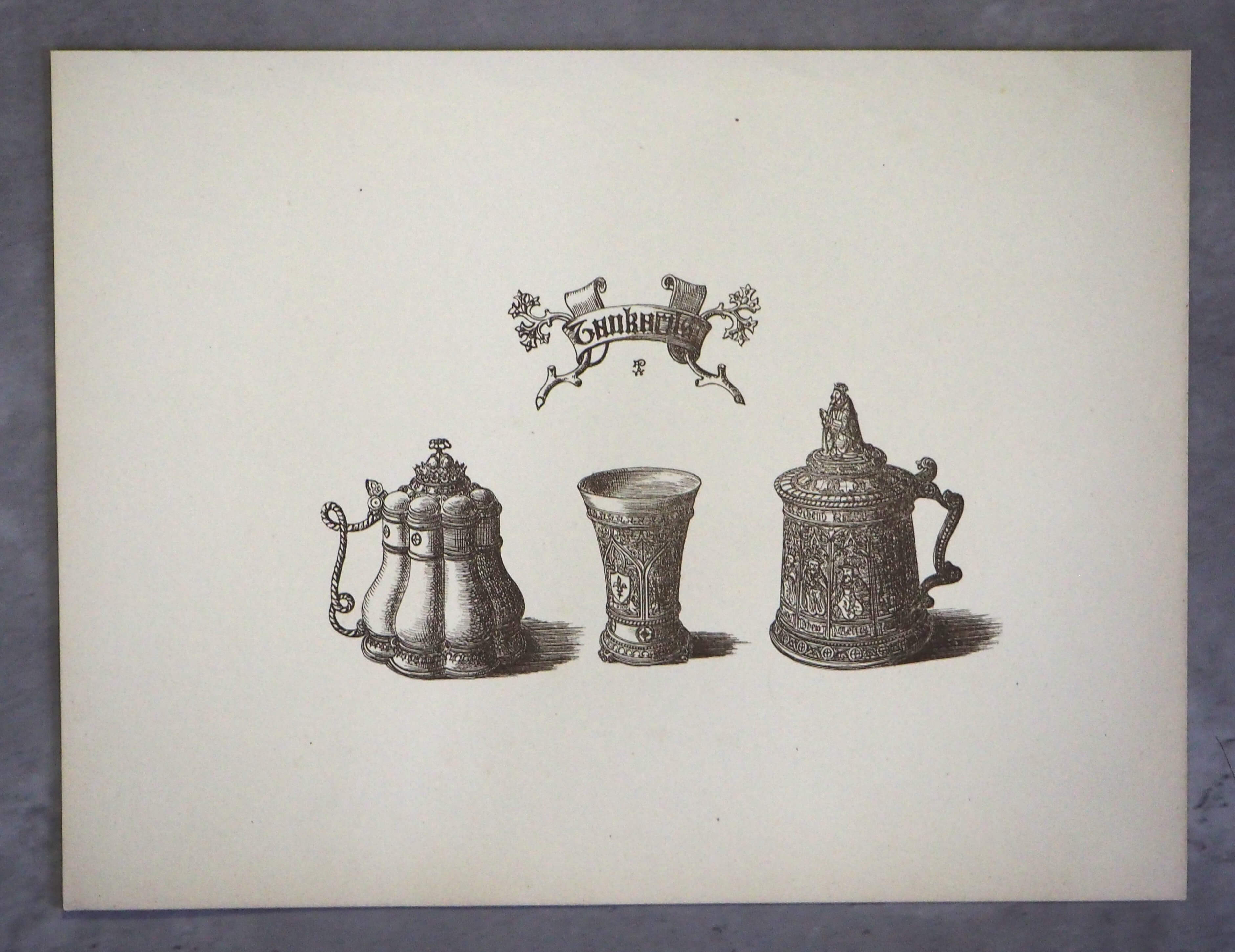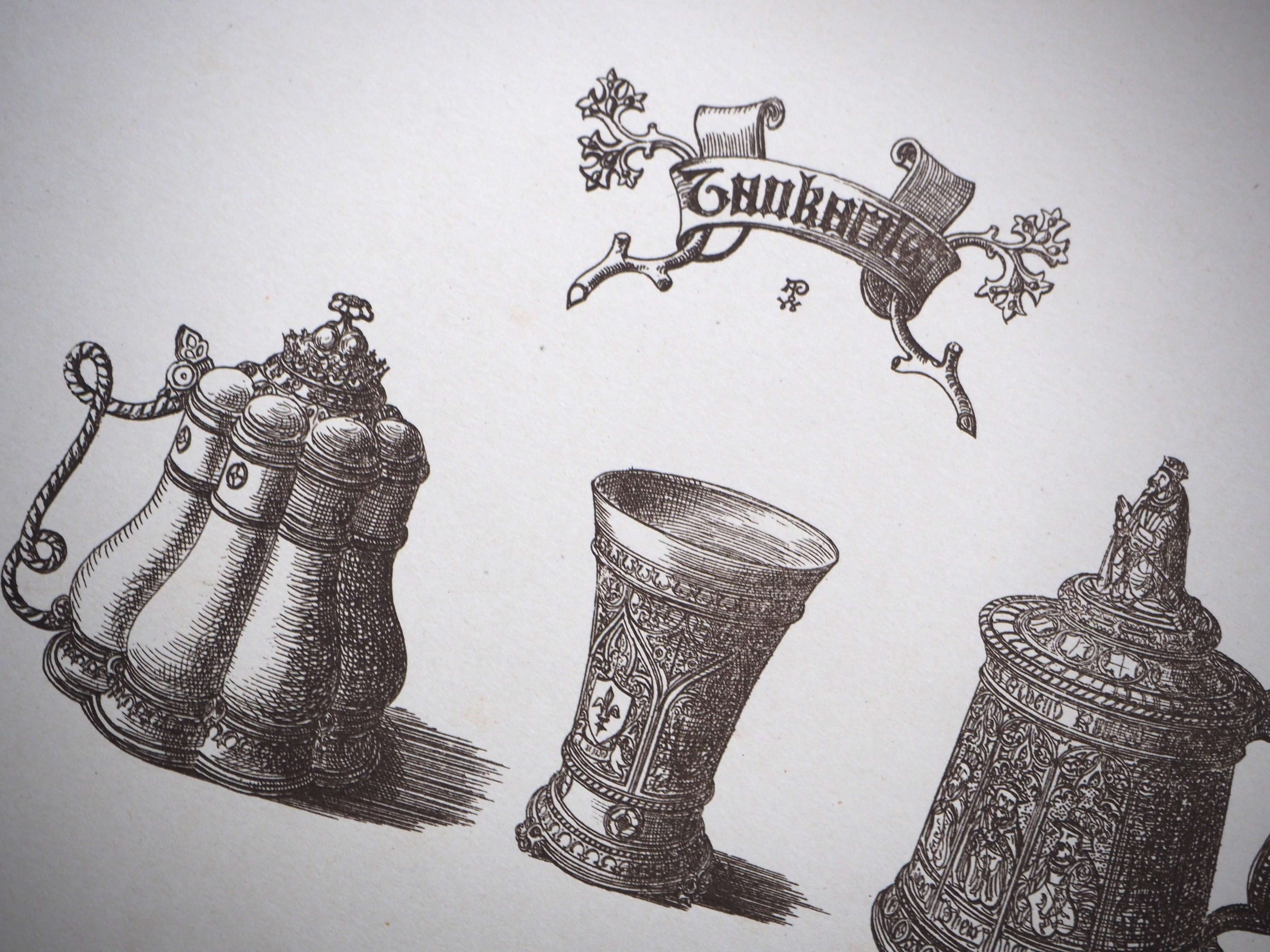 こちらには3つのタンカードが描かれています。右のタンカードの蓋には王様のようなモチーフが付いており、現代の感覚で見ると、なんだか可愛らしい印象もありますね。