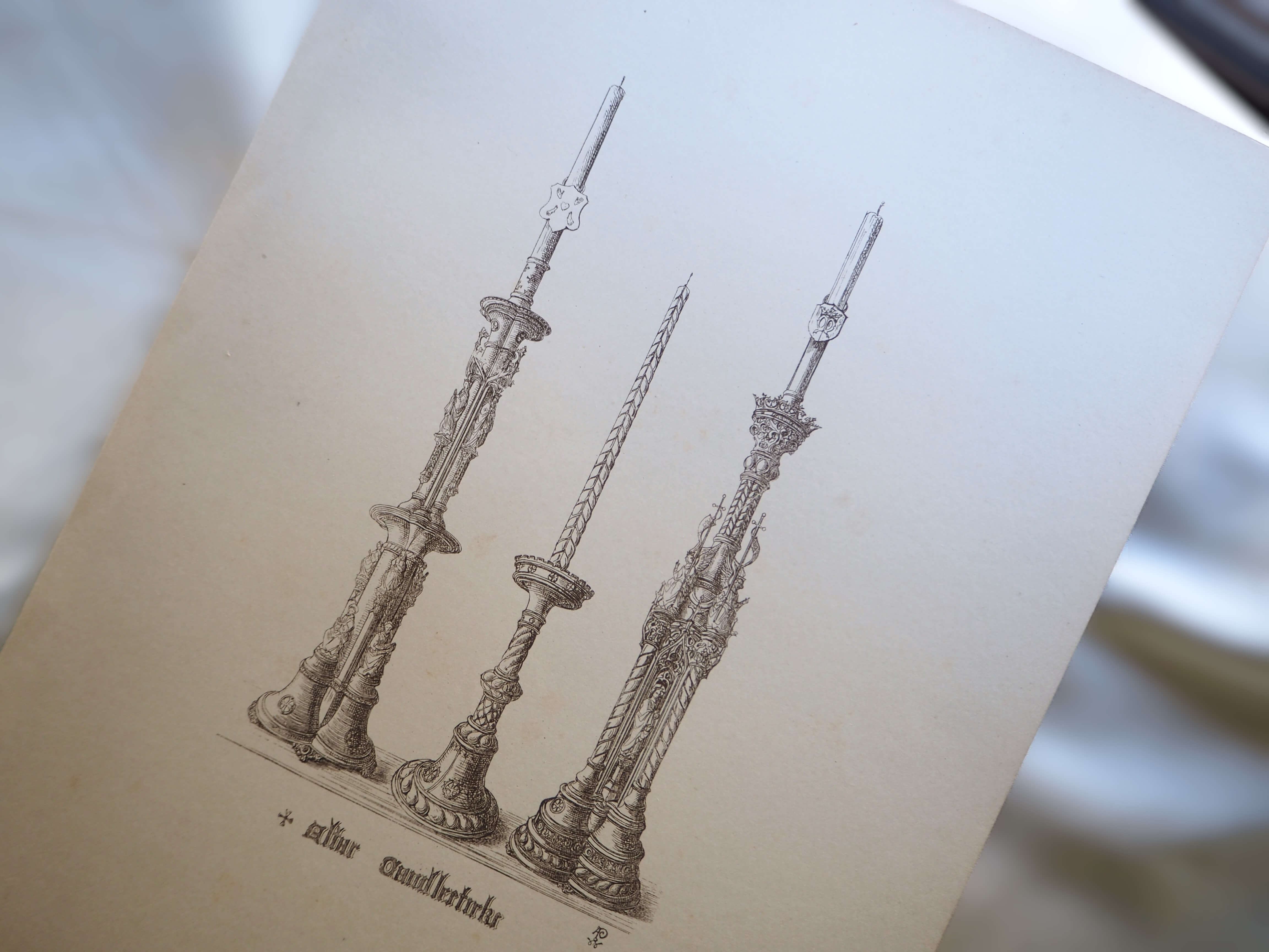 イギリス 15世紀と16世紀の装飾品 Altar Candlesticks 祭壇 燭台 版画 アンティーク キリスト教 カトリック wel-20 A.W.Pugin